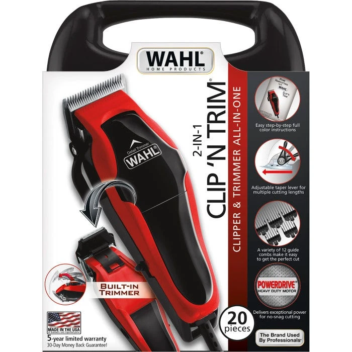 Wahl® Clip ‘N Trim® 2-in-1 Clipper & Trimmer is the only clipper with a built-in detail trimmer. It’s great for use on sideburns, necklines, and around the ears. It’s ergonomic shape makes it easy to hold and cut at different angles. It also contains a taper lever that adjusts the blade for multiple cutting lengths and a POWERDRIVE® heavy duty motor that delivers exceptional power for no-snag cutting. This clipper is a great all-in-one tool for at home haircutting