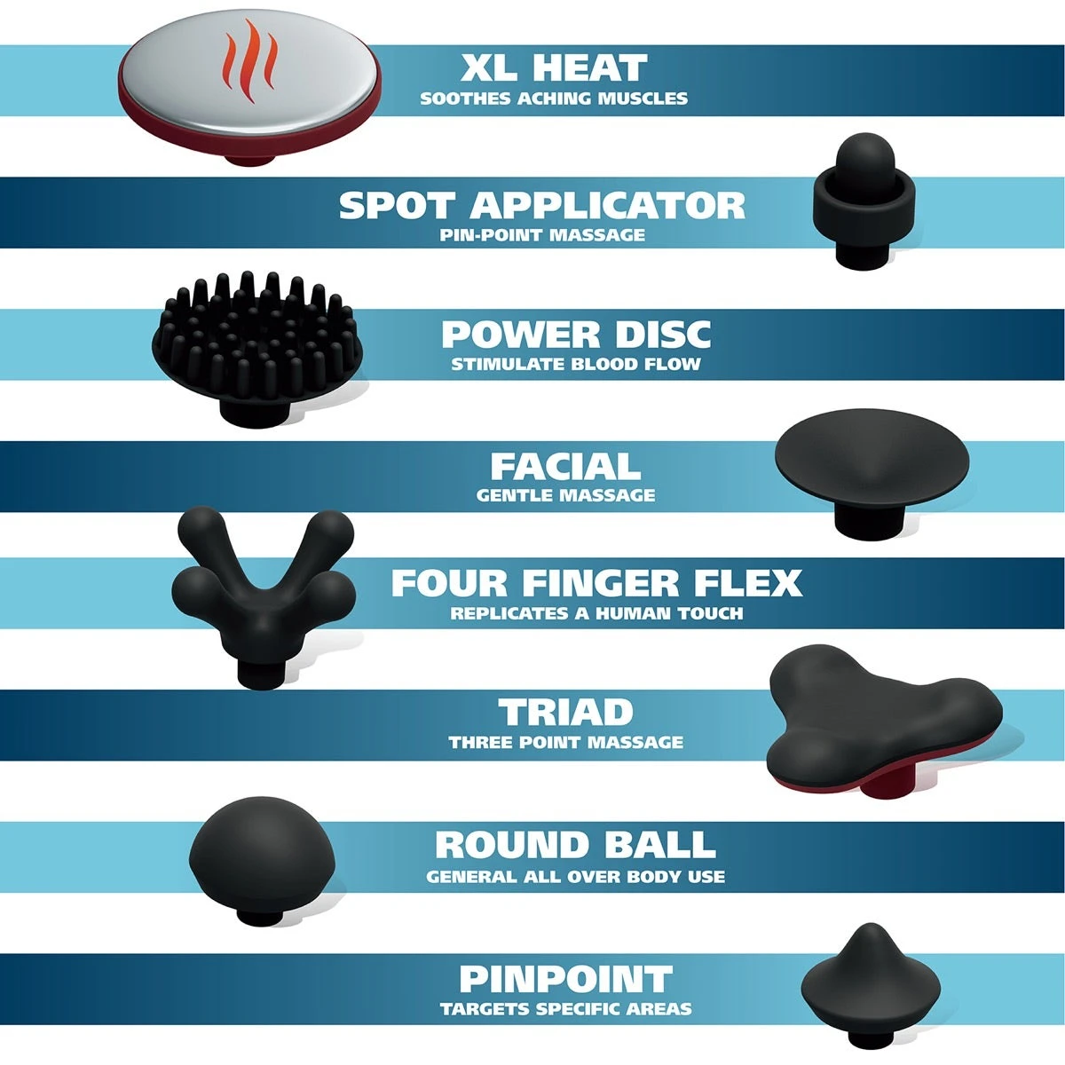 8 Unique Attachment Heads: Triad, Heat, Round Ball, Pinpoint, Four Finger Flex, Facial, Power Disc, & Soft Applicator