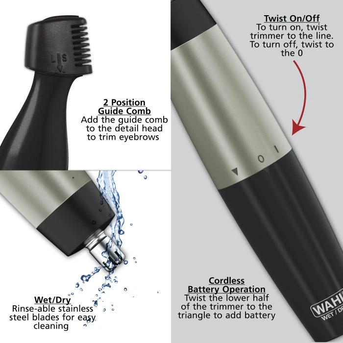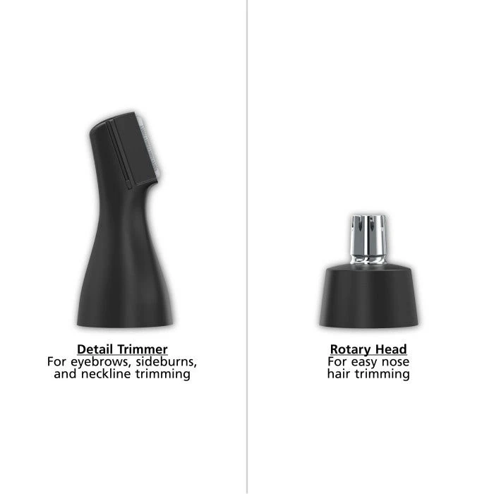 Wahl® GroomsMan® Lithium Powered Personal Trimmer allows you to trim and detail. This Wet/Dry trimmer comes with a detail head and a rotating head. Great for ears, nose, brows.