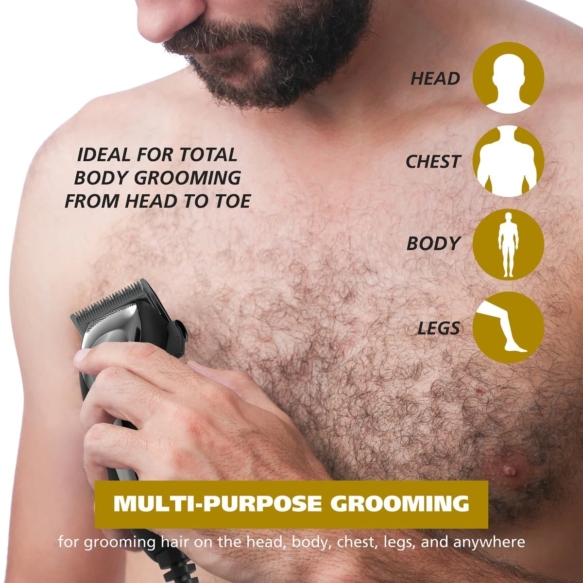 - Total body grooming clipper ideal for head, beard, and body grooming