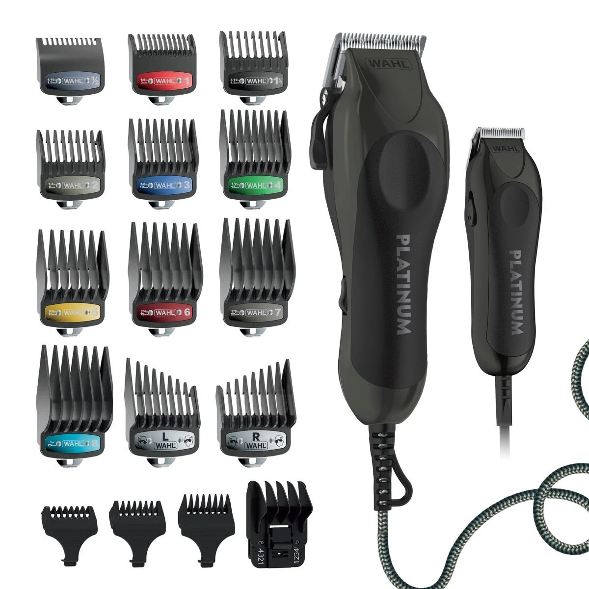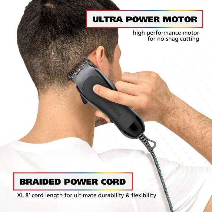 Wahl’s Pro Series™ Platinum High Performance Haircutting Kit comes with a premium hair clipper and trimmer. The multi-cut clipper contains self-sharpening precision blades, an adjustable taper lever, ultra power no-snag motor and an XL 8′ braided power cord for exceptional durability and flexibility. The included touch-up trimmer is corded for a constant stream of power. It is great for detail trimming the back of the neck, sideburns, and around the ears.