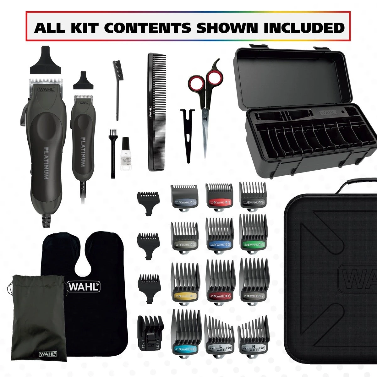 This kit also comes with premium accessories: 12 color coded premium secure-snap™ clipper attachment guards that provide cutting lengths between 1/16″-1″, 3 individual trimmer guards that provide beard cutting lengths from stubble to full and a 6-position trimer guide(1/16″-1/2″), a storage caddy for organizing guide combs, barber cape (28″ x 40″), cutting sheers, finishing tools, draw string guide comb bag and a large storage case to hold all accessories.