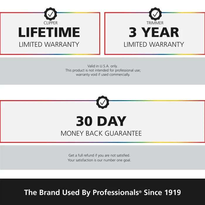 Both the clipper and trimmer come with warranties: Lifetime Limited Clipper Warranty & 3 Year Trimmer Warranty. As well as, a 30 day money back guarantee. This premium, high performance haircutting kit has everything you need for a successful at home haircut.