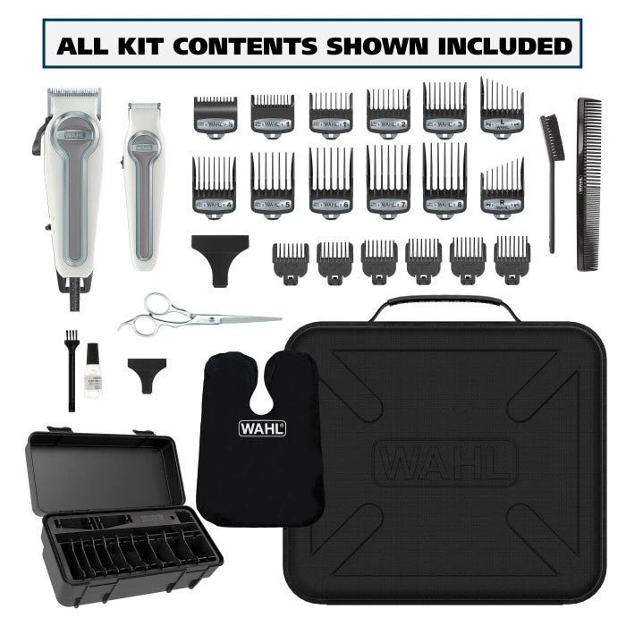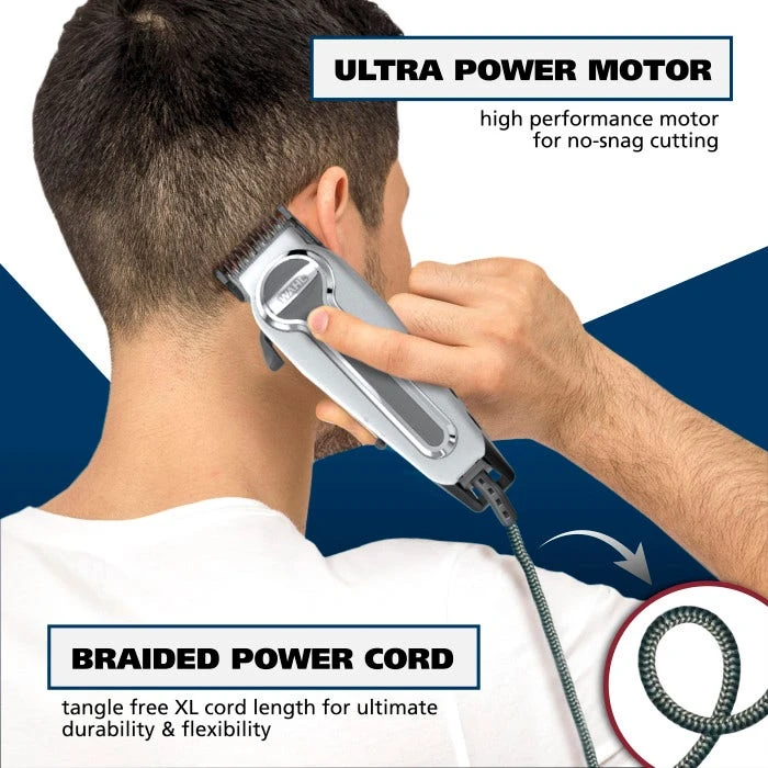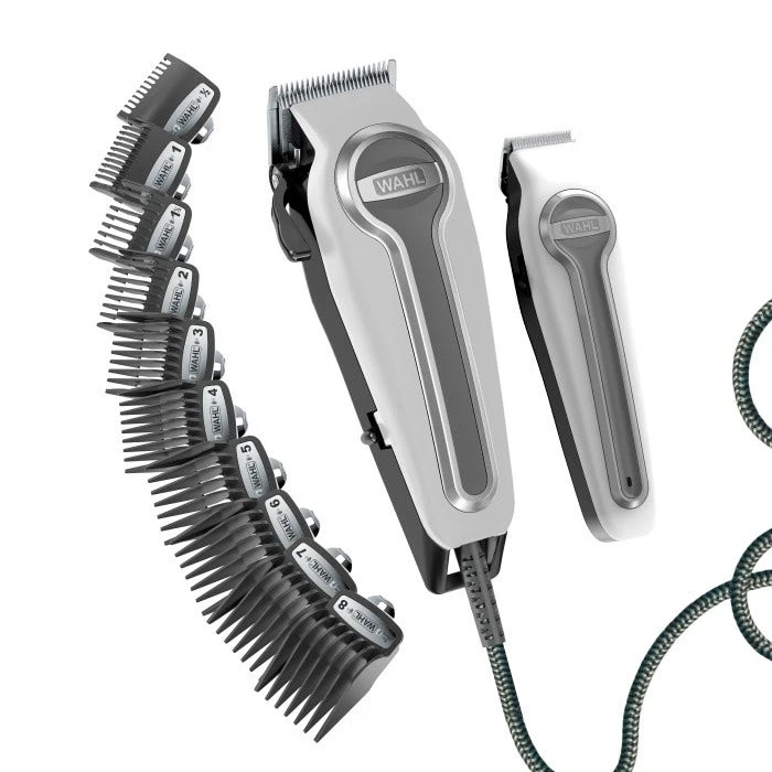 Wahl’s Pro Series™ High Performance Haircutting Kit comes with a premium hair clipper and trimmer. The multi-cut clipper contains self-sharpening precision blades, an adjustable taper lever, ultra power no-snag motor and an XL 8′ braided power cord for exceptional durability and flexibility. The included touch-up trimmer is rechargeable for cordless use. It is great for detail trimming the back of the neck, sideburns, and around the ears.
