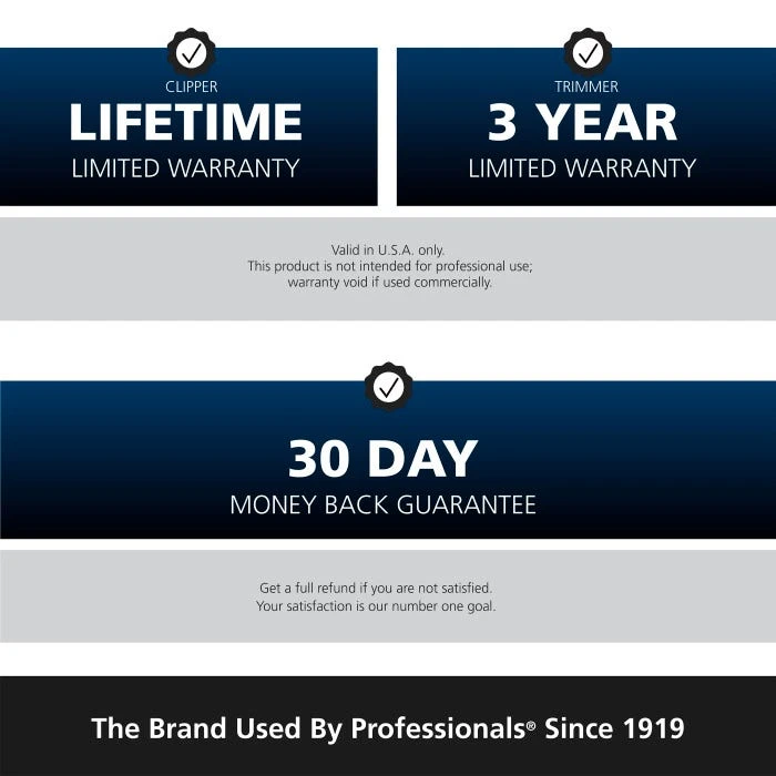 Both the clipper and trimmer come with warranties: Lifetime Limited Clipper Warranty & 3 Year Trimmer Warranty. As well as, a 30 day money back guarantee. This premium, high performance haircutting kit has everything you need for a successful at home haircut.
