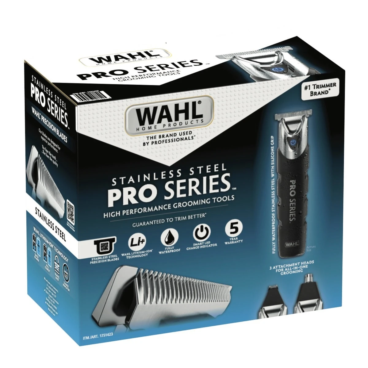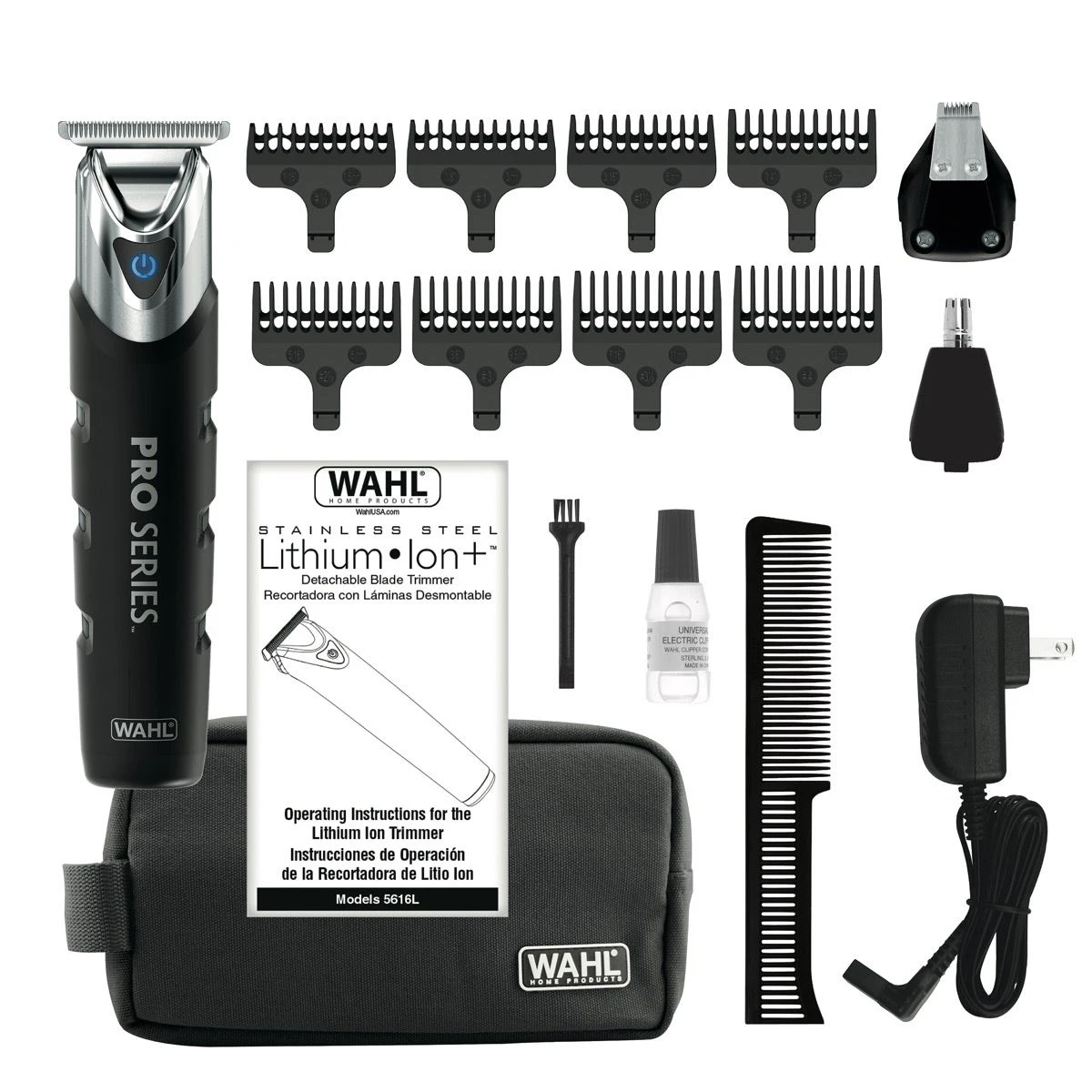 The Pro Series Stainless Steel High Performance Beard Trimmer for men is a multi-purpose grooming solution tailored for beards, touch-ups, and detailing. This trimming kit features 3 trimming heads: Pro-Grade T-Blade, Ear/Nose Trimmer, & Precision Detail Trimmer. The T-Blade trimmer contains self-sharpening blades that help define your style. The Ear/Nose trimmer provides a safe, easy, and hygienic way to groom ear, nose & brow hair. Lastly, the Precision Detail trimmer assists in slimline edging on the face, sideburns, or neckline for intricate designs and personal trimming. Achieve a variety of beard trimming lengths and styles by attaching any of the included 8 guide combs ranging in length from 1/16” to ½”. The Lithium-Ion rechargeable power gives you the power to trim freely without being tied down with a cord. Simply plug it in to charge and unplug for up to 4 hours of cordless runtime. Trim at the sink or in the shower with this fully waterproof trimmer. The no-slip silicone grip allows you to maintain control even in the slickest of environments. When you’re done trimming, you can store all of your trimming accessories in the included case for easy storage and travel.