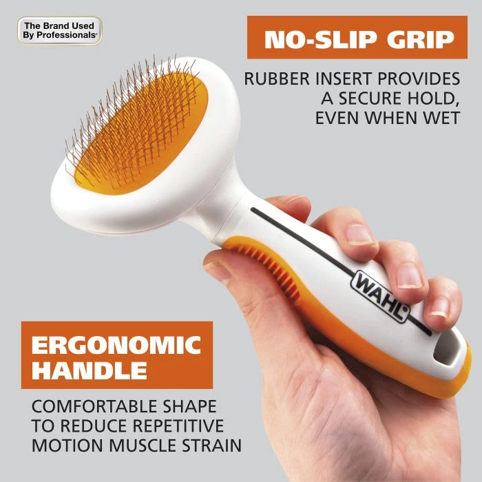 The Wahl® Small Slicker Brush is a sturdy brush that detangles matted fur and removes unwanted loose hair to keep your pet looking and feeling good. This type of brush works great for dogs with long, curly, or double coats. It contains an ergonomic no-slip grip handle for secure, comfortable handling. Its small head size is perfect for use on small to medium size dogs.